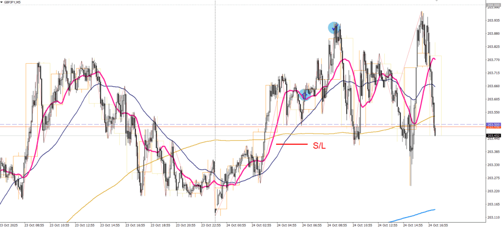 高市早苗首相の所信表明演説直後に伸びた5分足一波で決済、としました。