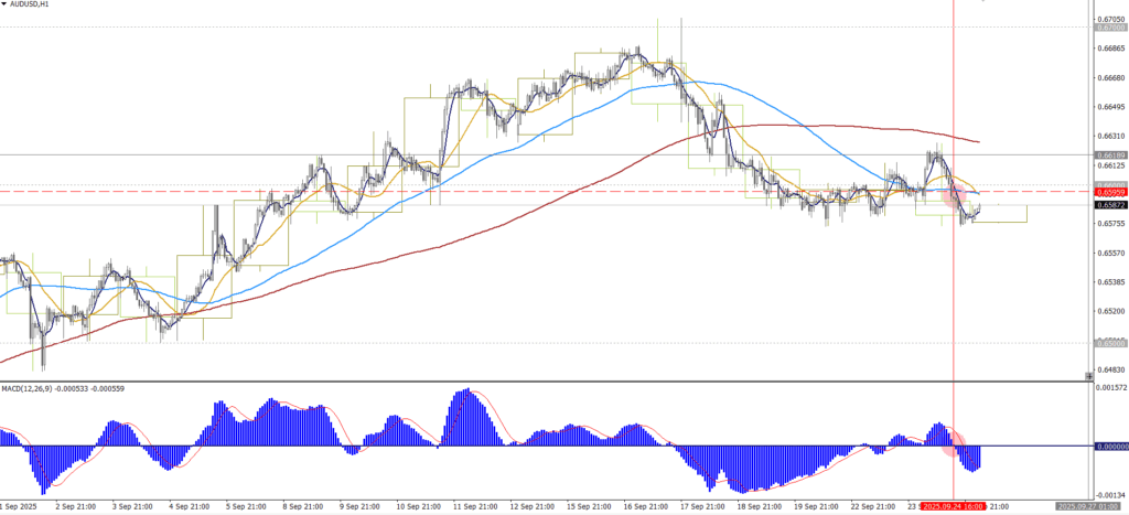 単純移動平均線80と20の並びがそろっていない、は不安要素ではありましたが、80(4時間足20SMA)の傾き、およびキリ番0.66000が強い抵抗ラインとなっていると判断しました。
