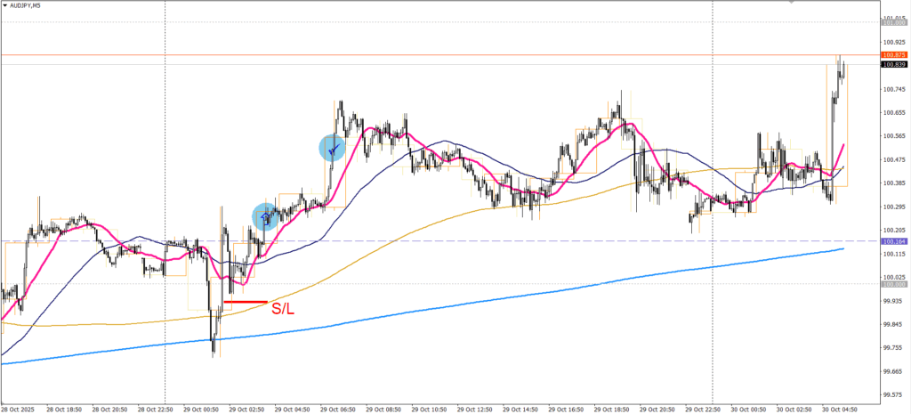 1時間足は直近高値ではありましたが、単純移動平均線(200—80—20—5)パーフェクトオーダーの根拠もあってブレイク上昇と判断です。